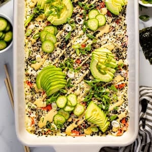 This dish is perfect for potlucks or backyard get-togethers! It’s super easy to throw together and is filled with all your favorite sushi flavors, with a twist!