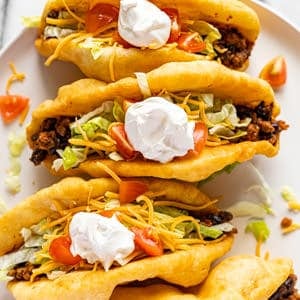 These copycat Taco Bell chalupas are better than the fast food favorite and loaded with all your favorite taco toppings! Using a homemade fried dough “boat” to house delicious taco meat, cheese, and lettuce, these chalupas will quickly become a family favorite.
