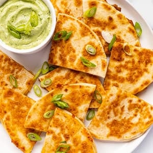 - Serve with my homemade Creamy Avocado Sauce! Add just a few minutes to your prep time, and throw together my delicious 5 Minute Avocado Sauce – it’s the perfect dip for your quesadilla!