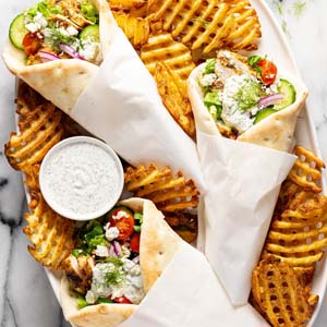 - Serve sliced chicken in pita bread along with lettuce, cucumber, tomato, and red onion. Drizzle with dill yogurt sauce and sprinkle crumbled feta over everything. Enjoy!