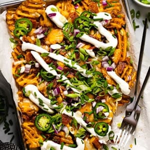 - If you’re serving these loaded fries to kiddos, you can carefully remove the parchment paper from the baking sheet and transfer them fries to a serving platter or right to the table so that no one burns themselves on the warm edges of the baking sheet.
