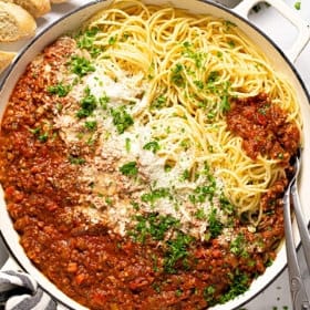 Bolognese is typically a thicker and meatier sauce than a traditional spaghetti sauce. Spaghetti sauce usually has a looser texture, is made with mainly tomatoes, and doesn’t always have meat in it. Spaghetti sauce goes well with thinner cuts of pasta like spaghetti while bolognese goes well with wider cuts of pasta like pappardelle or lasagna, but it will be delicious with whatever pasta you have on hand!