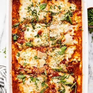 - Spread a heaping 1/2 cup of sauce in the bottom of a 9×13 inch baking dish. Layer 7-8 slices of zucchini over the sauce. Add 1/2 of the cottage cheese mixture. Then drizzle with another heaping 1/2 cup of sauce.